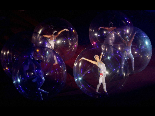 Flags of different franchises were carried by women inside big bubbles and acrobatics were performed by artists who used big size circles and cubes to showcase their skills, enthralling the sparse crowd.
