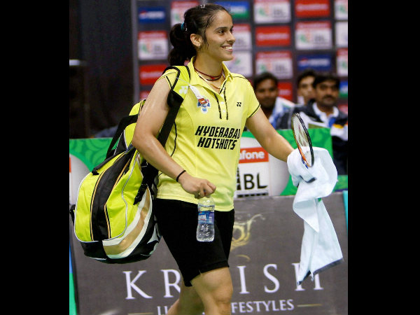 Hyderabad Hotshots' Saina Nehwal smiles as she leaves the court after defeating PV Sindhu of Awadhe Warriors. Hyderabad won 3-2.