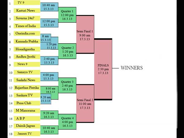 The TV-9 and Kasthuri News teams are slated to line up against each other at 10.40 a.m. The match between Suvarna 24/7 and Times of India will be held around 12 p.m.