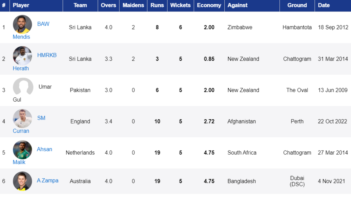 | 5. Sam Curran (ENG) | 5/10 | Afghanistan | Perth | 22 Oct 2022 |
