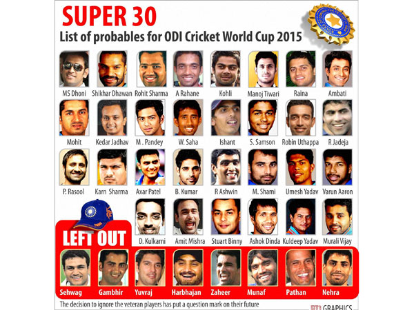Mumbai, Dec 4: India's preliminary 30-man squad for the ICC World Cup 2015 was today announced by the BCCI selection panel in Mumbai. There was no place for veterans Virender Sehwag, Gautam Gambhir, Yuvraj Singh, Zaheer Khan and Harbhajan Singh, which almost signals the end of their international careers.