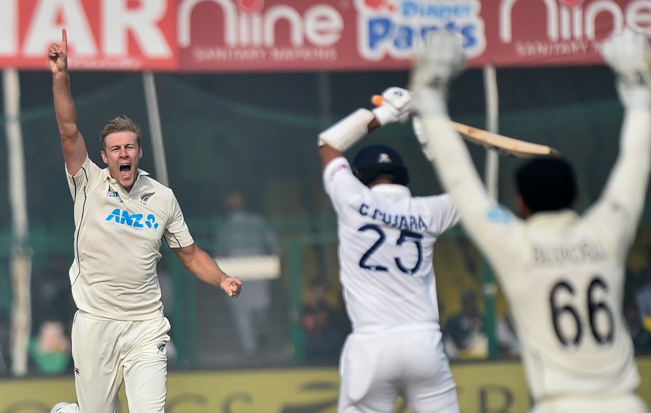 Kanpur, November 28: Tim Southee's double wicket maiden over and Kyle Jamieson's early strike puts New Zealand on top against India heading into lunch on day 4 of the first Test at the Green Park in Kanpur on Sunday (November 28).