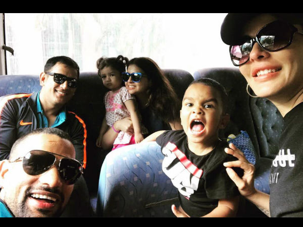 Dhawan's son Zoravar was seen bonding with Dhoni's daughter Ziva. The two kids were seen having fun during Team India's journey to their next destination.