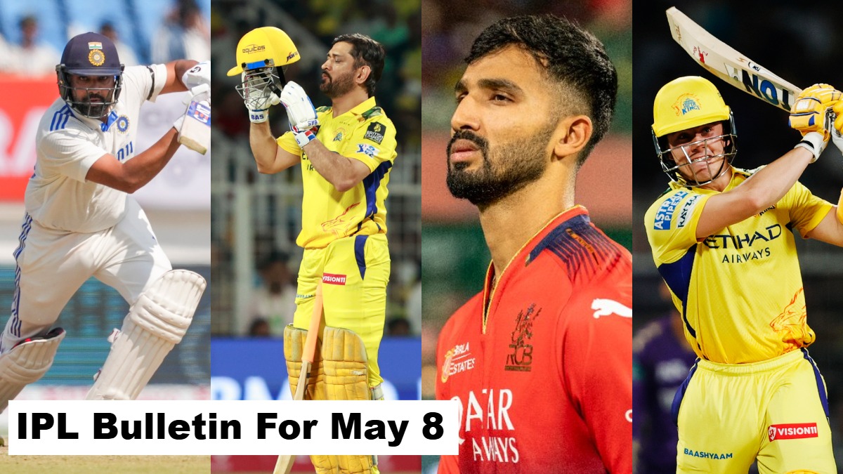 IPL Bulletin For May 8: The Indian Premier League 2025 continued to dazzle with its unmatched drama and emotions on May 8, delivering a bittersweet cocktail of legendary farewells and rising stars. The cricketing world woke up to a historic announcement as India captain Rohit Sharma confirmed his retirement from Test cricket.