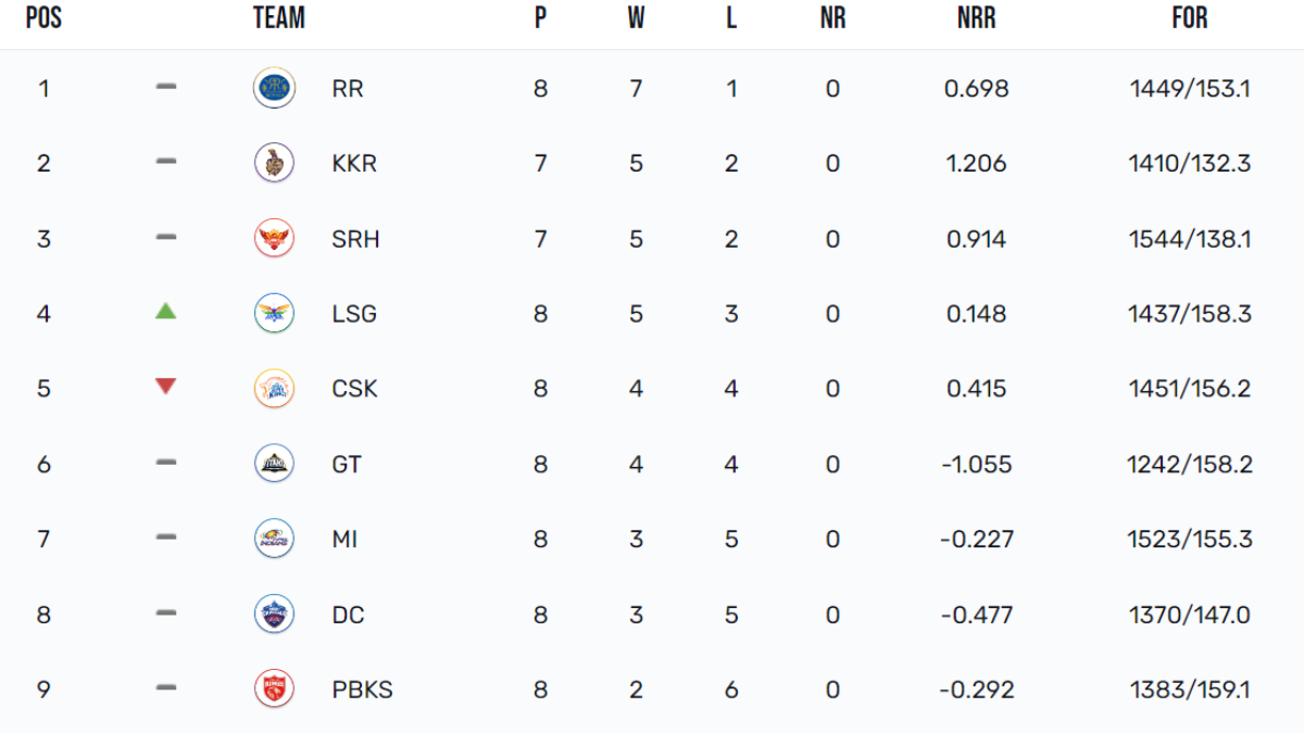 | Rajasthan Royals | 14 | 8 | 7 | 1 | +0.698 |