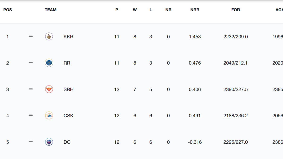 | Kolkata Knight Riders | 16 | 11 | 8 | 3 | +1.453 |