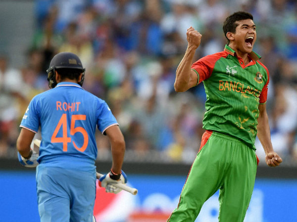 Taskin Ahmed (right) celebrates after dismissing Rohit Sharma at 2015 World Cup