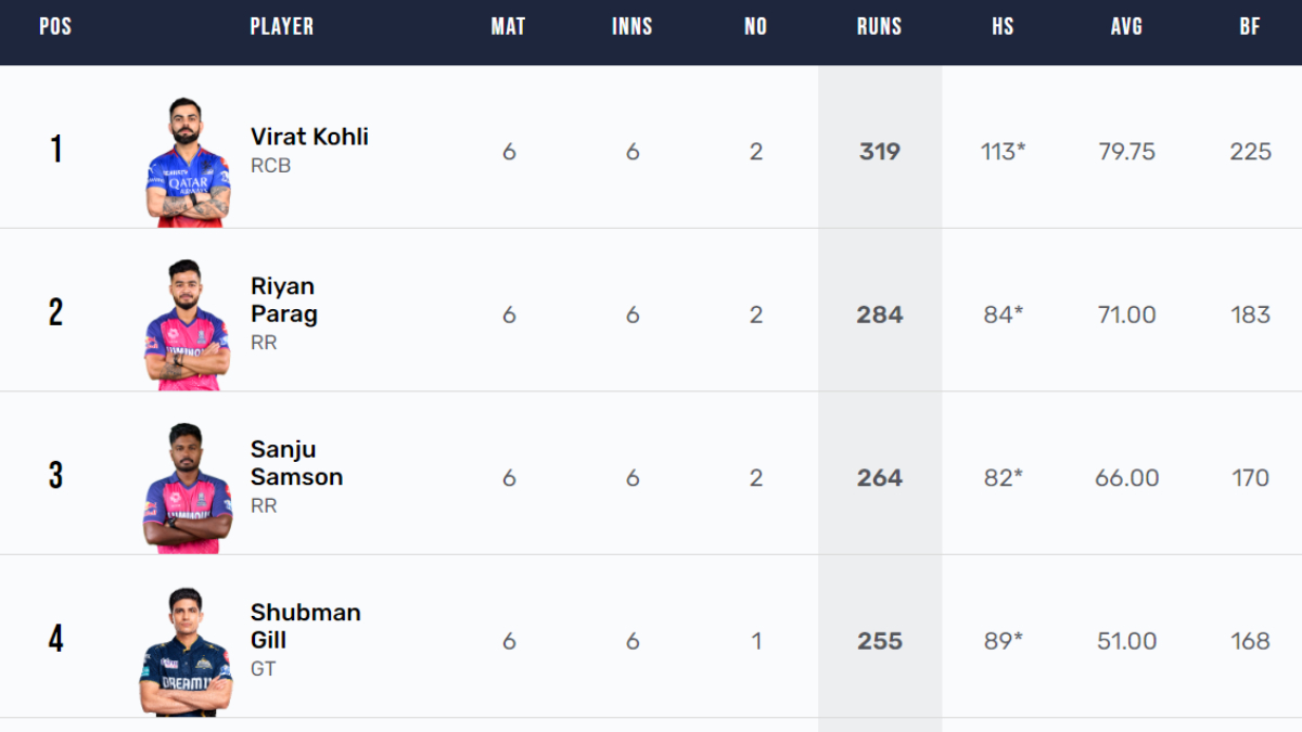 | Shubman Gill (GT) | 255 | 89 | 6 | 19 | 9 |