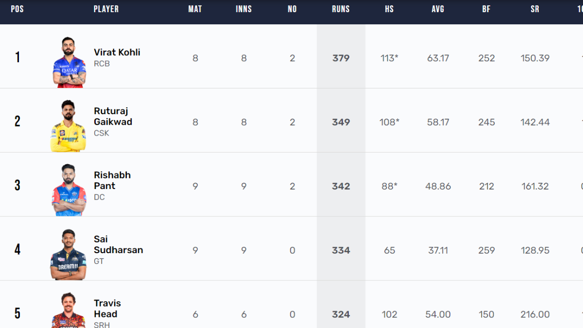 | Ruturaj Gaikwad (CSK) | 349 | 108* | 8 | 38 | 10 |