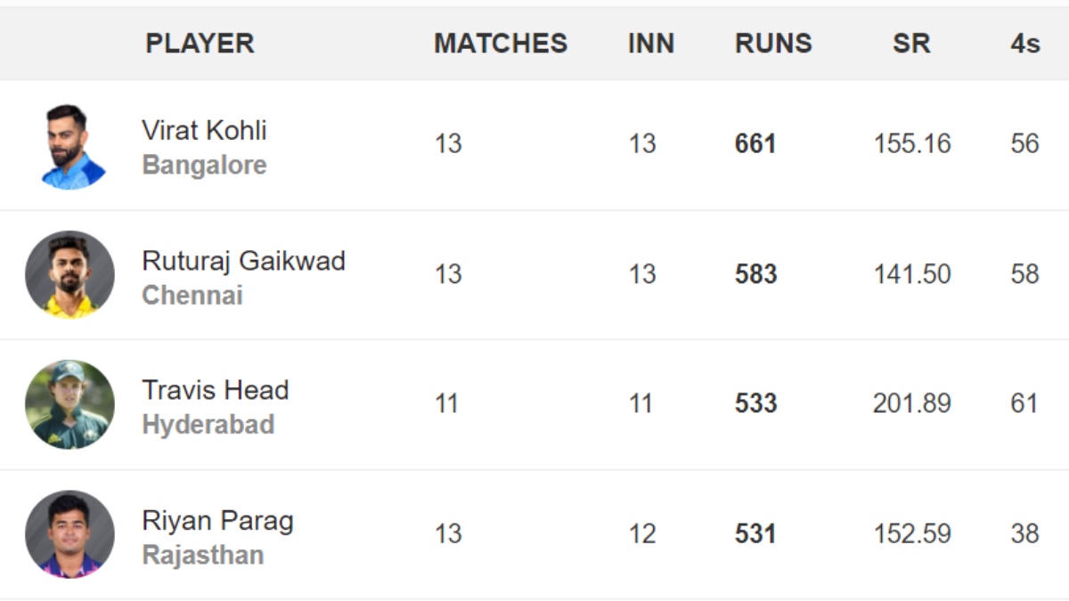 | Virat Kohli (RCB) | 661 | 113* | 13 | 5 | 1 | 56 | 33 |