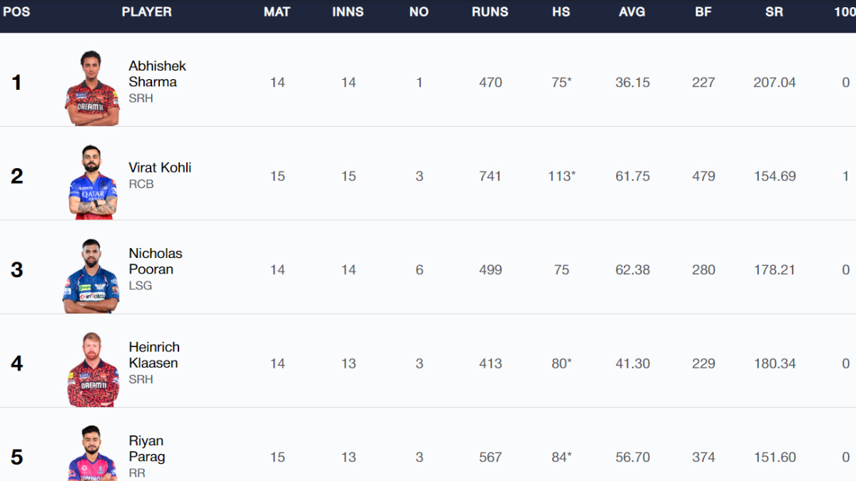 With second-placed Virat Kohli already out of the race, Sharma may feel he will finish at the top this season but his teammates Heinrich Klaasen, Travis Head may get going while in-form Riyan Parag is also in the run. Let's take a look at how their performances affect our table below:
