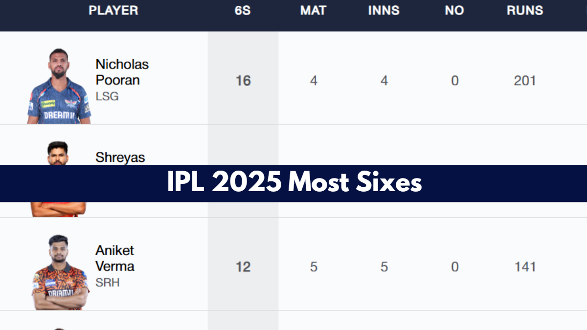 Most Sixes In IPL 2025: LSG's Nicholas Pooran, who also currently holds the Orange Cap, continues to be the leading six-hitter of the tournament with 16 sixes to his name so far. Also read: Most Runs in IPL 2025 | IPL Points Table | Most Wickets | Fairplay Award