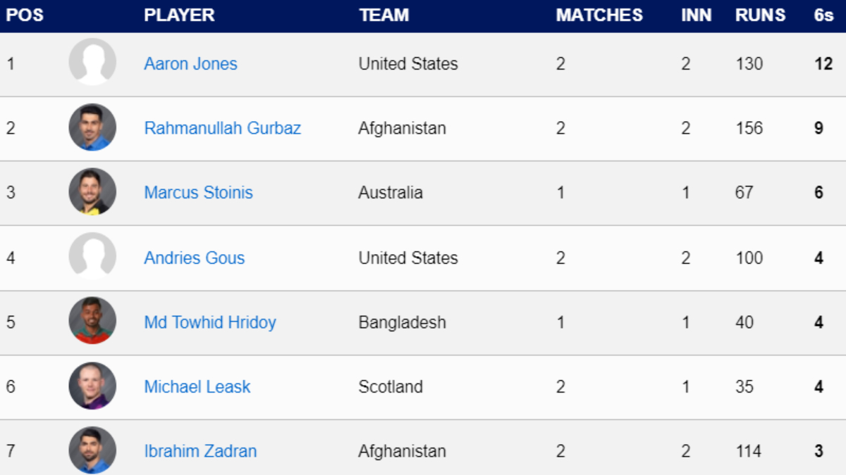 The breathing space, however, has shrunk for the USA batter as Rahmanullah Gurbaz played another influential knock while also taking the lead in the Most Runs list. Let's take a look at the complete list of Most Sixes individually followed by the team list.