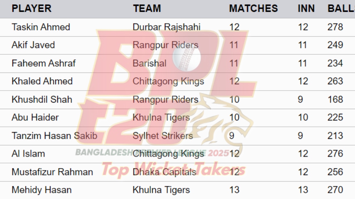 Most Wickets in BPL 2025: Taskin Ahmed ends the Bangladesh Premier League 2025 as the leading wicket-taker as his 25-wicket haul in the league stages was too much for the rest of the pack to catch up.