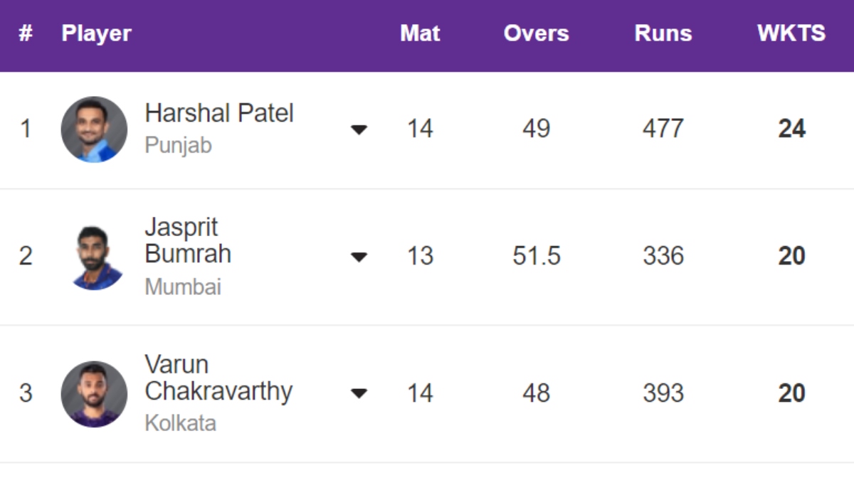 | 1. Harshal Patel (PBKS) | 24 | 14 | 3/15 | 9.73 | 0 | 0 |