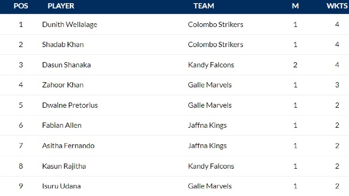 Most Wickets in Lanka Premier League 2024: Colombo Strikers duo Dunith Wellalage and Shadab Khan are tied at the top in the Highest Wicket-takers list of the tournament with four wickets each in the opening game against Kandy Falcons.