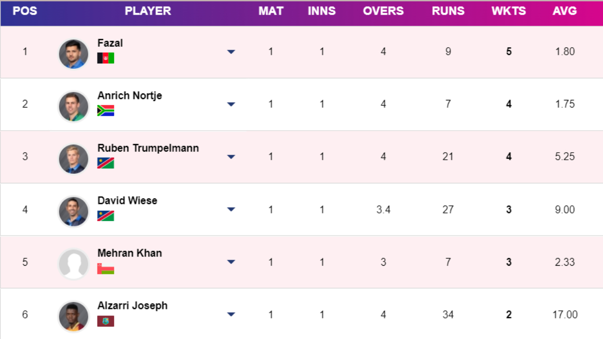 | 4. Mehran Khan (OMA) | 3 | 1 | 3/7 | 2.33 | 0 | 0 |
