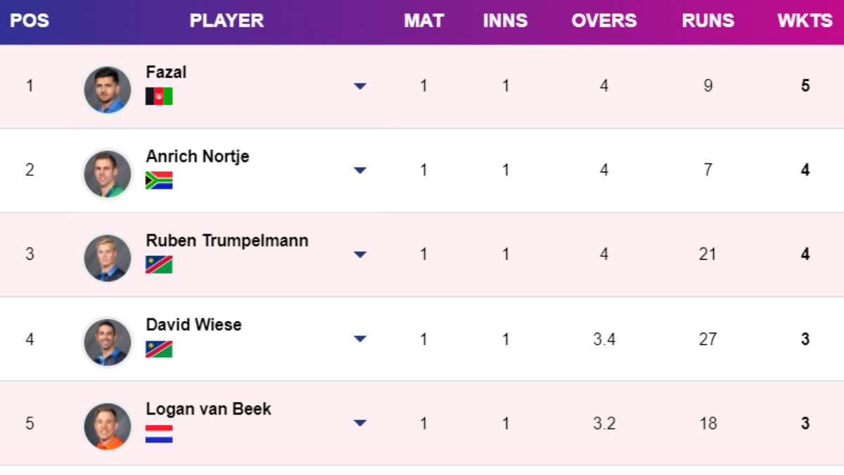 Most Wickets in T20 World Cup 2024 - Updated after Namibia vs Scotland: Fazalhaq Farooqi's spectacular five-wicket spell against Uganda keeps him at the top of the Most Wickets list as of June 5. Also Read: Most Runs in T20 World Cup | Most Sixes | Points Table
