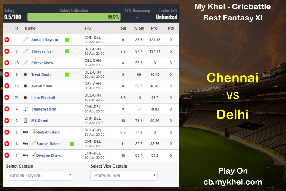 My XI - Ambati Rayudu (captain), Shreyas Iyer (vice-captain), Prithvi Shaw, MS Dhoni, Suresh Raina, Shane Watson, Trent Boult, Avesh Khan, Liam Plunkett, Rishabh Pant, Dwayne Bravo