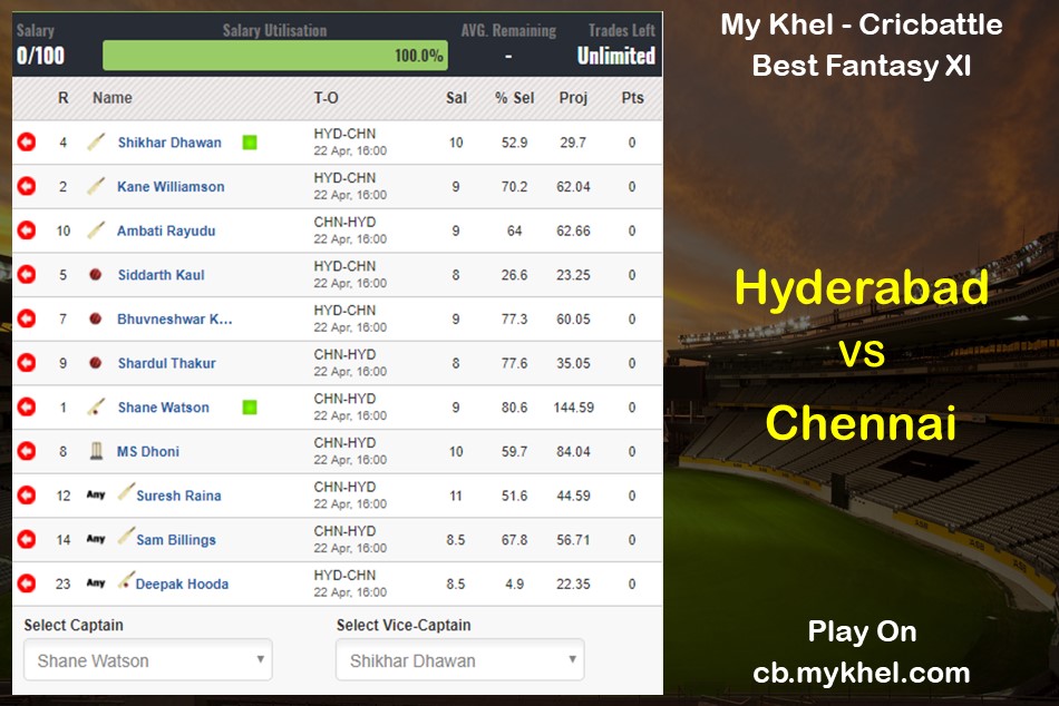 My XI: Shane Watson (Captain), Shikhar Dhawan (Vice-Captain), Deepak Hooda, Bhuvneshwar Kumar, Kane Williamson, Ambati Rayudu, Siddarth Kaul, Shardul Thakur, MS Dhoni, Suresh Raina, Sam Billings.
