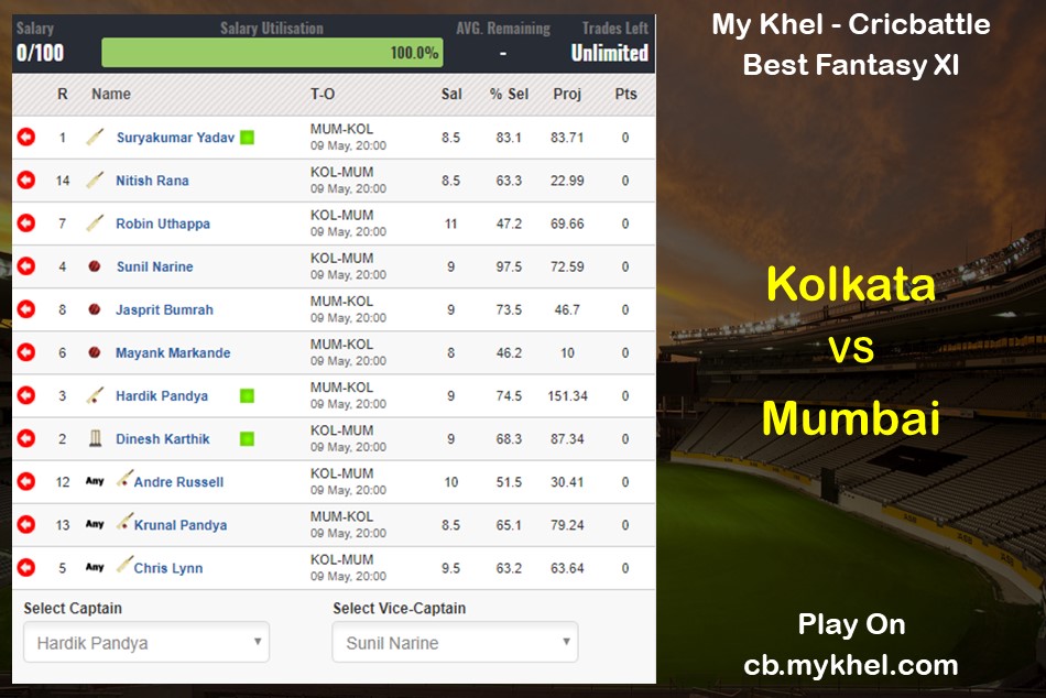 My XI - Hardik Pandya (Captain), Sunil Narine (Vice-Captain),Suryakumar Yadav, Jasprit Bumrah, Nitish Rana, Robin Uthappa, Mayank Markande, Dinesh Karthik, Andre Russell, Krunal Pandya, Chris Lynn