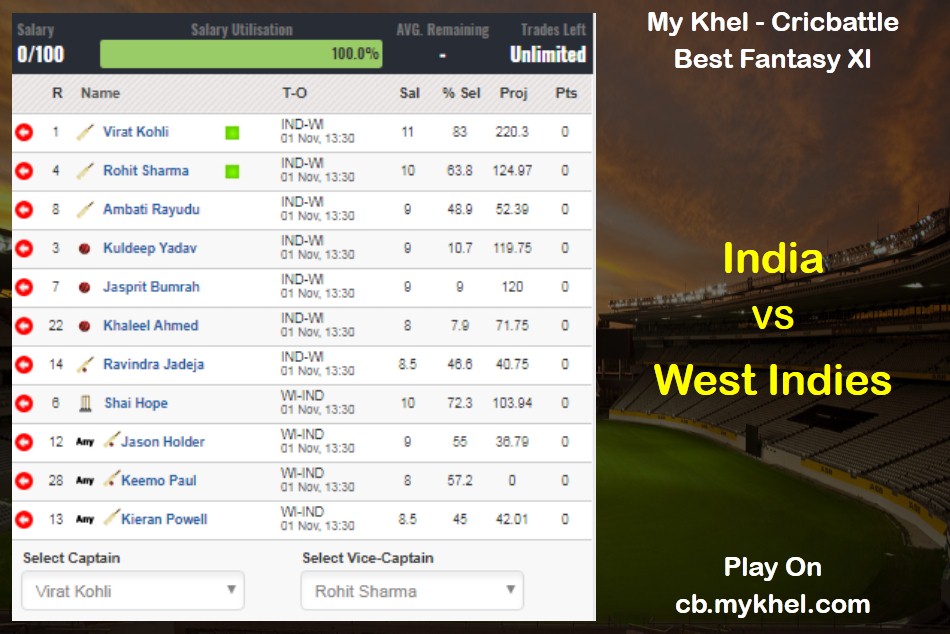 My XI - Virat Kohli(Captain), Rohit Sharma (Vice-Captain), Shai Hope(WK), Ambati Rayudu, Kuldeep Yadav, Jasprit Bumrah, Khaleel Ahmed, Ravindra Jadeja, Jason Holder, Keemo Paul, Kieran Powell.