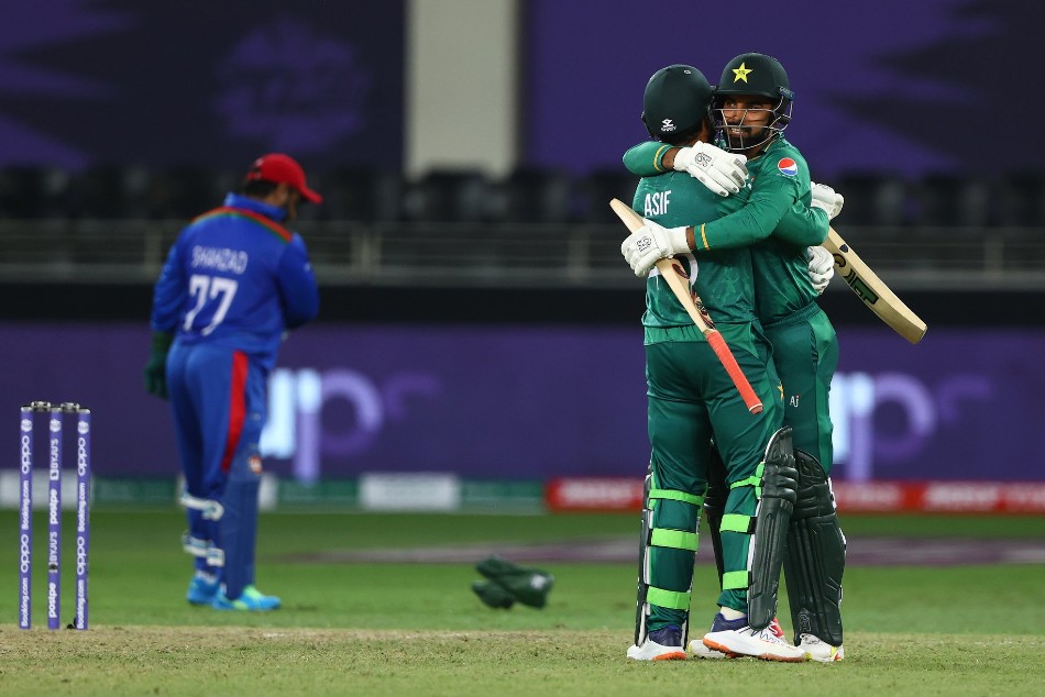 Dubai, October 29: Pakistan batter Asif Ali displayed his big-hitting prowess as he hammered four monstrous sixes in the penultimate over bowled by Karim Janat to give Pakistan third successive win in the ongoing ICC T20 World Cup 2021 here at Dubai International Stadium.
