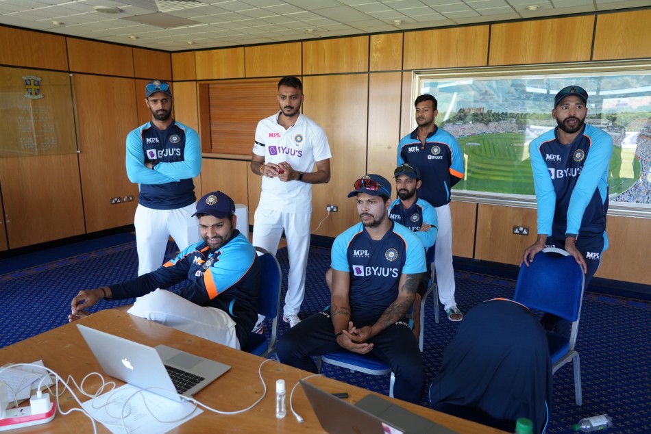 The Indian Cricket Team's social media handle shared an image from the Indian dressing room in Durham, where Rohit, Ajinkya Rahana, Mayank Agarwal, Umesh Yadav, Axar Patel, Hanuma Vihari, and Md Siraj are also glued to the screens watching the match.