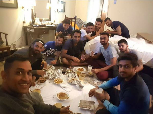 In a photo posted by pacer Jaydev Unadkat, skipper Dhoni is seen having dinner with his teammates, not in a five star hotel or a restaurant but to everyone's surprise all of them are sitting on the floor and relishing the food.