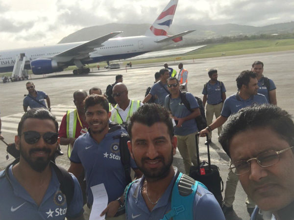 New head coach Anil Kumble posted a photograph of the team in his twitter handle and wrote: "Reached St. Kitts... long flight..@cheteshwar1 @klrahul11 @y_umesh Tour begins @BCCI." (History beckons Virat Kohli on West Indies tour)