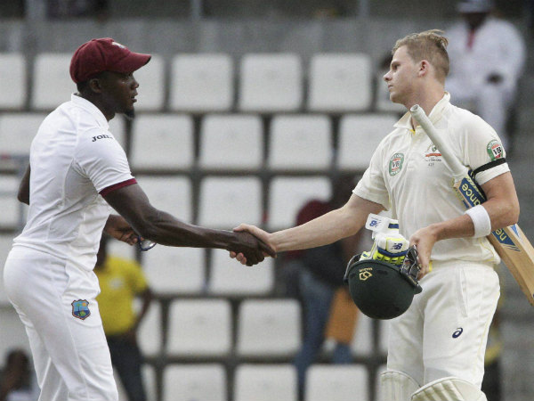 Jerome Taylor, left, shakes hands with Steve Smith at the end of their first Test