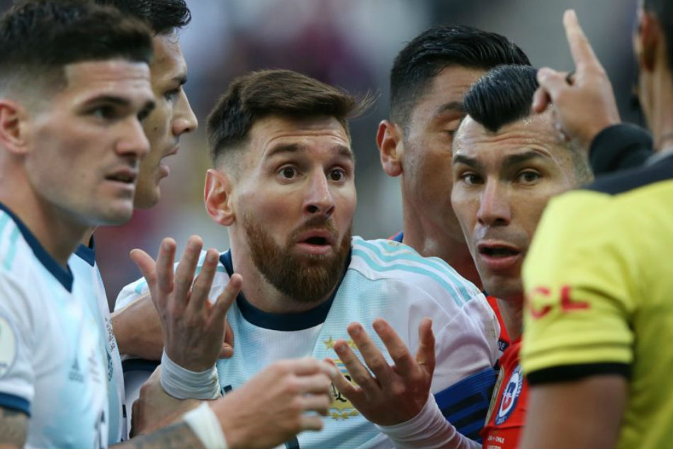 The five-time Ballon d'Or winner appeared to be the victim of shoving by Chile's Gary Medel, but the referee sent both players off after 37 minutes with Argentina already two goals to the good.