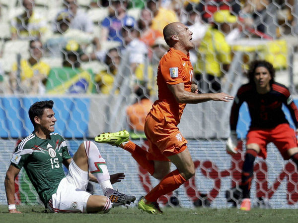 Netherlands' Arjen Robben (in orange) goes down under a challenge from Mexico's Hector Moreno during a World Cup 2014 pre-quarterfinal match at the Arena Castelao in Fortaleza, Brazil, Sunday, June 29, 2014. The Dutch won the match 2-1 in penalty. PTI