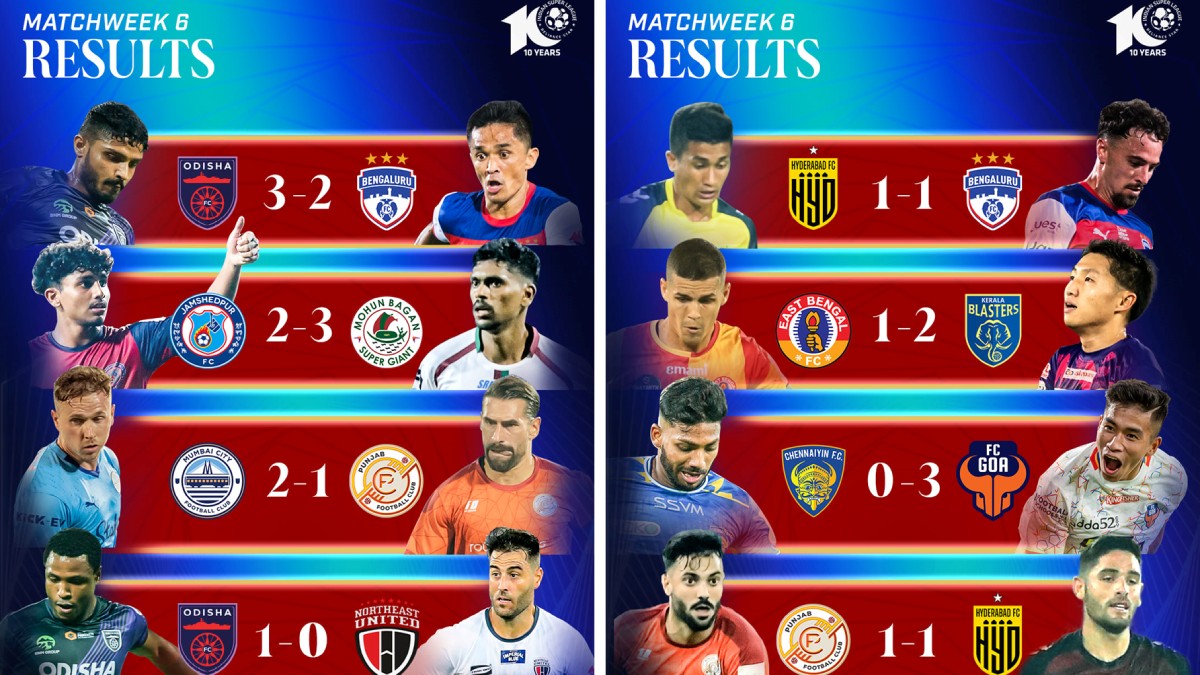 The teams who have yet to win a game this season, Hyderabad FC and Punjab FC, are at the bottom of the standings, followed in the top six by FC Goa and Kerala Blasters FC, Mohun Bagan Super Giant, Mumbai City FC, Odisha FC, and NorthEast United FC. These are the Indian top-tier players' hits and misses from the previous week.