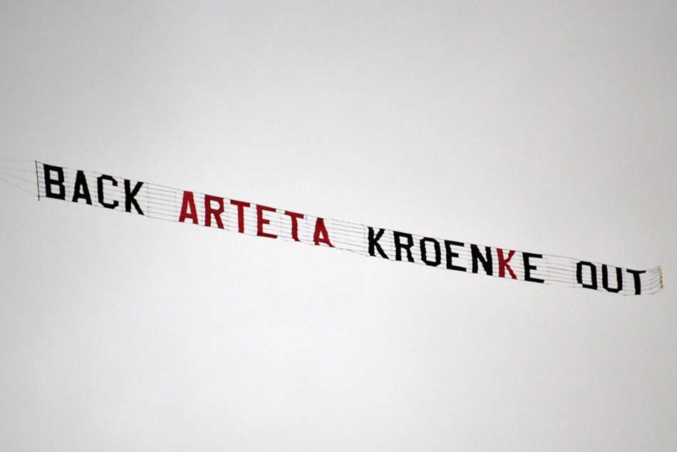 Ahead of the game, a banner flown over Villa Park – seemingly from an Arsenal fan – read: "Back Arteta, Kroenke out."