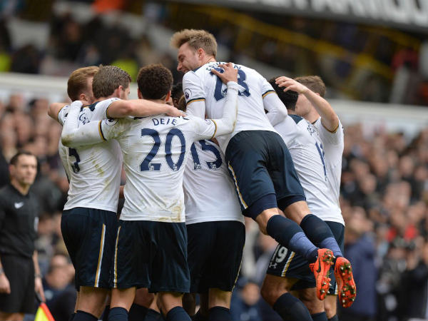 Tottenham Hotspur players celebrate a thumping 4-0 win over Stoke City to go up to the second position in the league table.