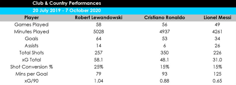 The Pole has the best goal tally (64), shot conversion rate (25 per cent) and minutes per goal ratio (79) across club and country appearances and has outperformed his xG total by six goals.