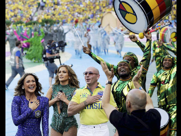 The giant ball opened and took the form of a flower. Brazilian singer Claudinha surfaced from under it along with Pop icon Jennifer Lopez and rapper Pit Bull.