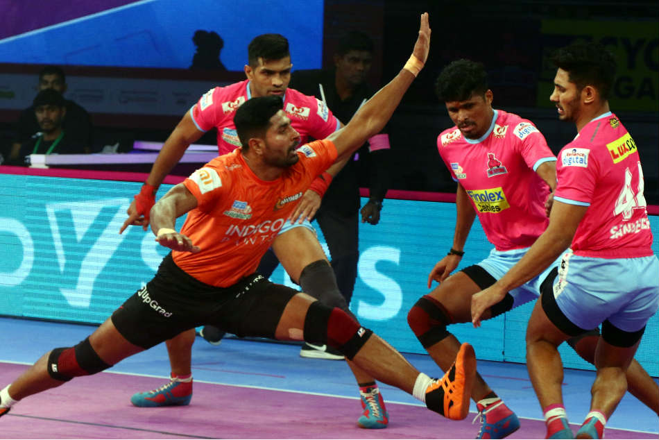 Siddharth Desai scored two raid points in four minutes as U Mumba led 4-2. Deepak Hooda got Jaipur Pink Panthers back in the game with successful raids as they trailed 4-5. U Mumba scored six straight points to lead 11-5 but a super tackle in the 9th minute helped Jaipur avert an all out.
