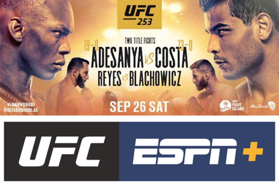 UFC 253: Adesanya vs. Costa will take place Saturday, September 26 on Abu Dhabi's Yas Island and will stream live on Pay-Per-View, exclusively through ESPN+ in the U.S. at 10 p.m. ET/7 p.m. PT in both English and Spanish.
