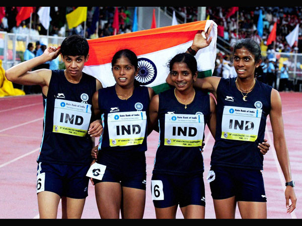 India's Nirmala, Luka Tintu Jose Anu Mariam and Poovamma celebrate after winning the gold medal in the 4x400 meter relay during the Asian Athletic Championship at the Balewadi stadium in Pune.