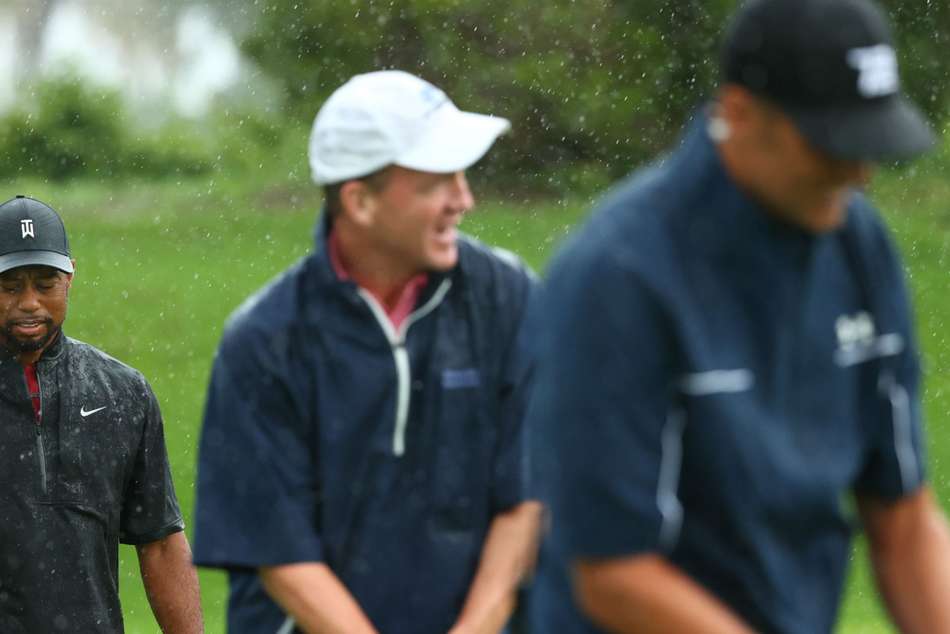 Woods, wearing his famous Sunday red, and Mickelson ensured the first hole was halved after their legendary quarterback team-mates were wayward from the tee in the rain with concerns that a storm may be on the way.