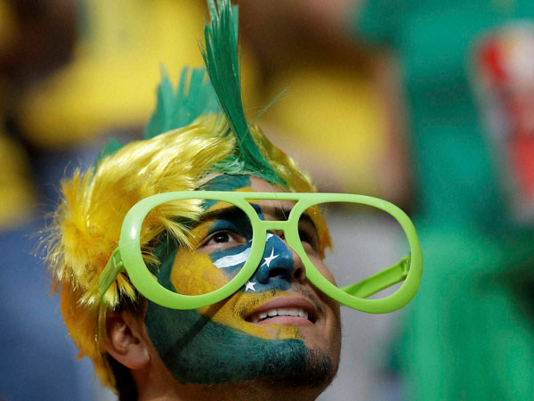 A Brazil fans cheers prior to the group A World Cup soccer match between Cameroon and Brazil at the Estadio Nacional in Brasilia, Brazil, Monday,