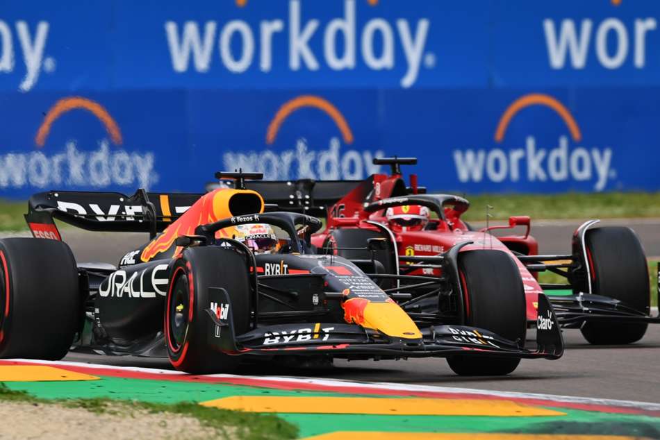 But, as Leclerc's right front faded, Verstappen struck a blow for Red Bull as he got himself within a second at the DRS zone on the start-finish straight and swept around the outside of the Ferrari into the Tamburello chicane.