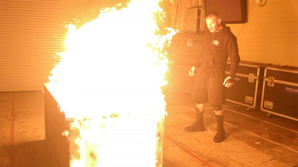 The duo entered a garage as Orton placed Wyatt inside of a large wooden box and locked it from outside. He grabbed a tank of gasoline and poured it all over the wooden box. After emptying the gas can, he dropped a lighter on top of the box, igniting it in the.